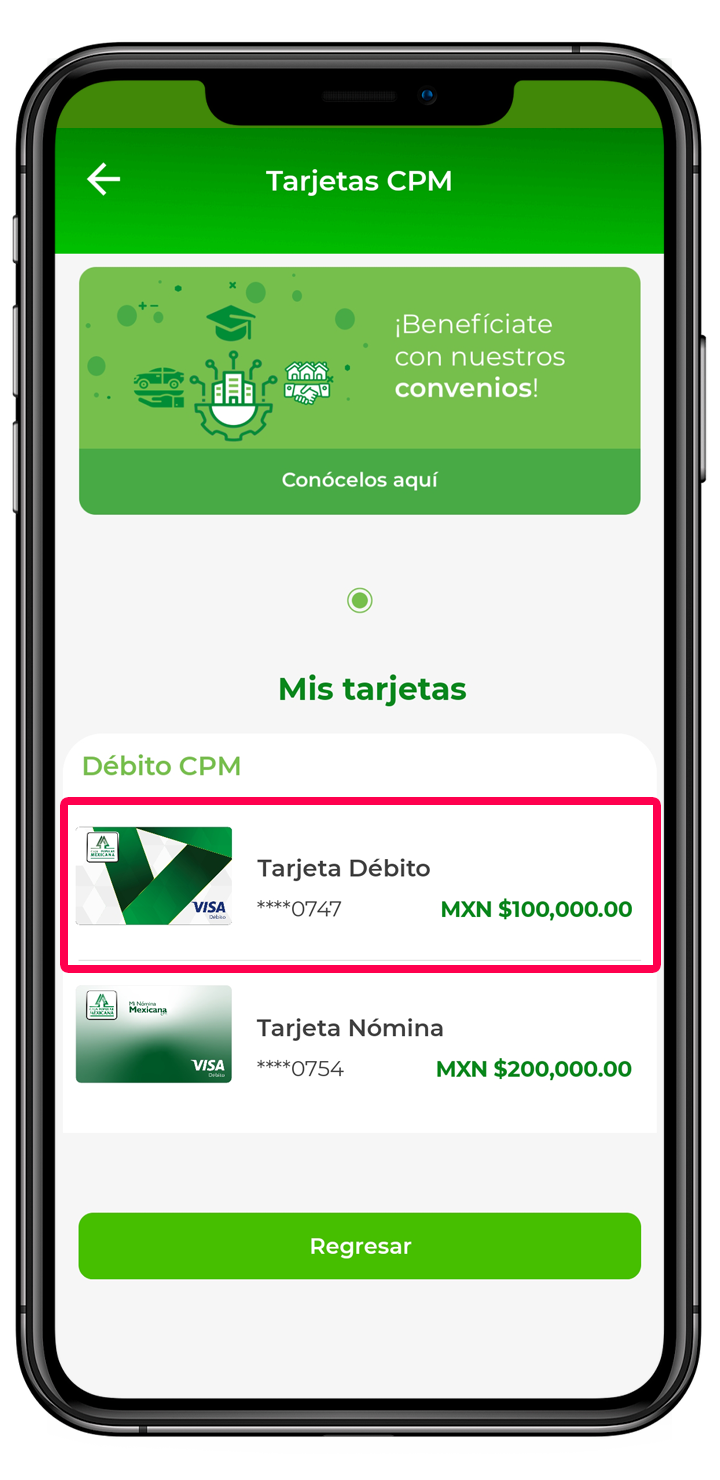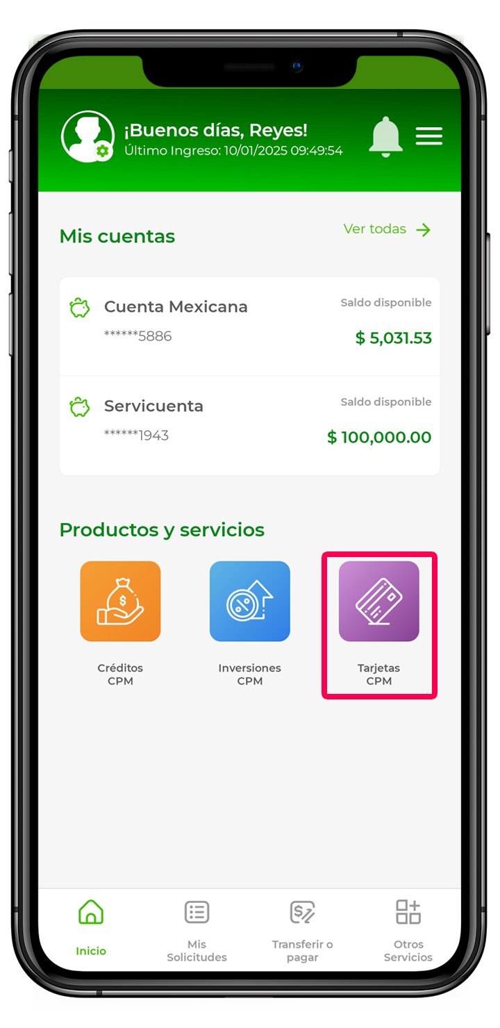 * También puedes ingresar dando clic en el icono de “Tarjetas” que aparece en la parte inferior. Introduce tu contraseña y sigue a partir del paso cuatro de esta guía.
