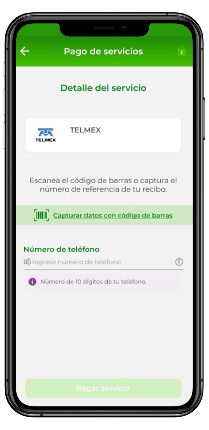 *** Para CFE es número de servicio y para Telmex puedes ingresar el número de teléfono o podrás escanear el código de barras de tu recibo.